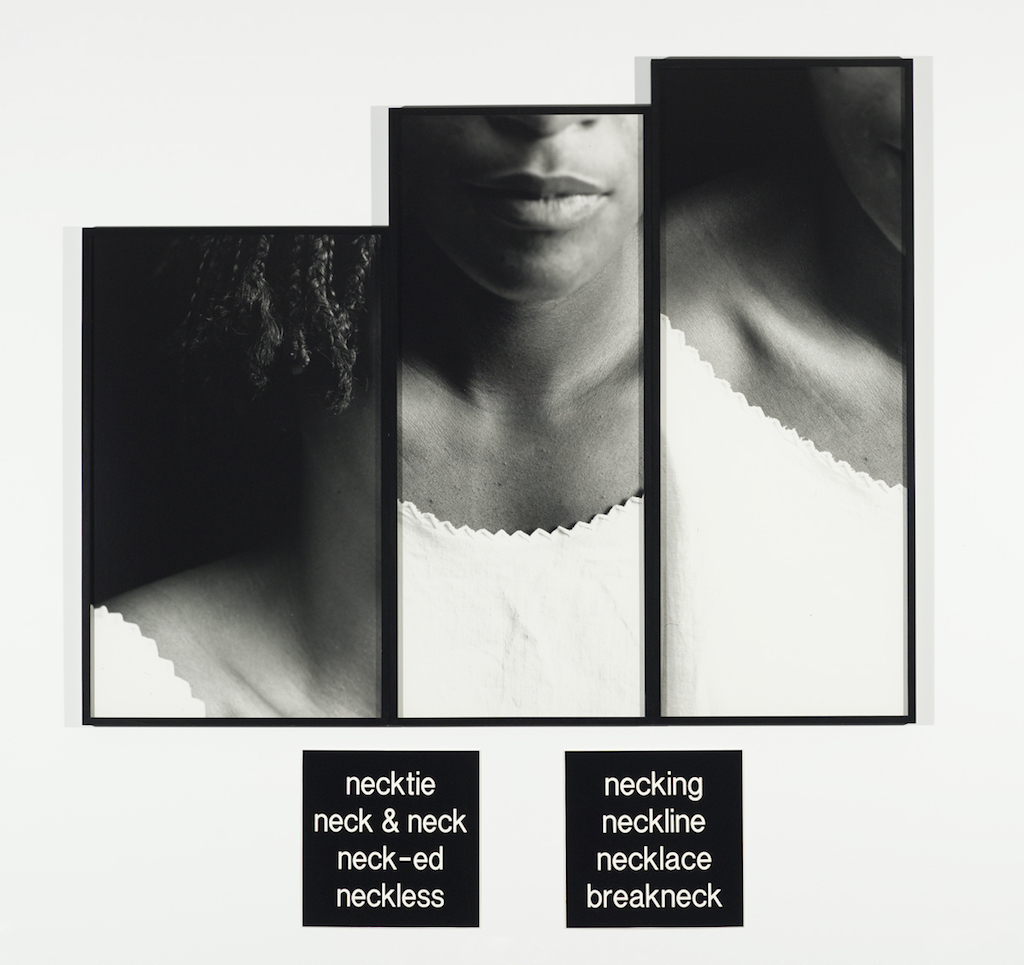 Lorna Simpson. Necklines, 1989; gelatin silver prints and engraved plastic plaques; 68 1/2 x 70 in. Collection of SFMOMA; Accessions Committee Fund purchase. © Lorna Simpson.