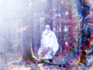 Moorhead’s curatorial statement references the raven’s mythological role as friend of mankind. In fact, research in the great book The Mind of the Raven, by the ornithologist Bernd Heinrich, indicates that ravens are so intelligent that they team with hunters to indicate where prey is, in the knowledge that they will benefit from the leavings. Thus myth and science converge. Binder is not a scientist, however; he apparently sees himself in the tradition of the Brothers Grimm and other bloody-minded fabulists. Using effects that add rainbow fractures to his images of deer, birds, and (pretty cornball) masked and costumed figures in the forest at night, he attempts to reinvigorate a timeworn tradition of occult meaning lurking just beyond the film of everyday reality. One’s patience with the project is torn between appreciation of powerful images such as an all-white owl in snow at night whose reddish brown eyes are the only color in sight, and one’s recollection of twentieth-century history, when the essentialist mythopoetics around notions of primeval purity led to gruesome political ramifications.