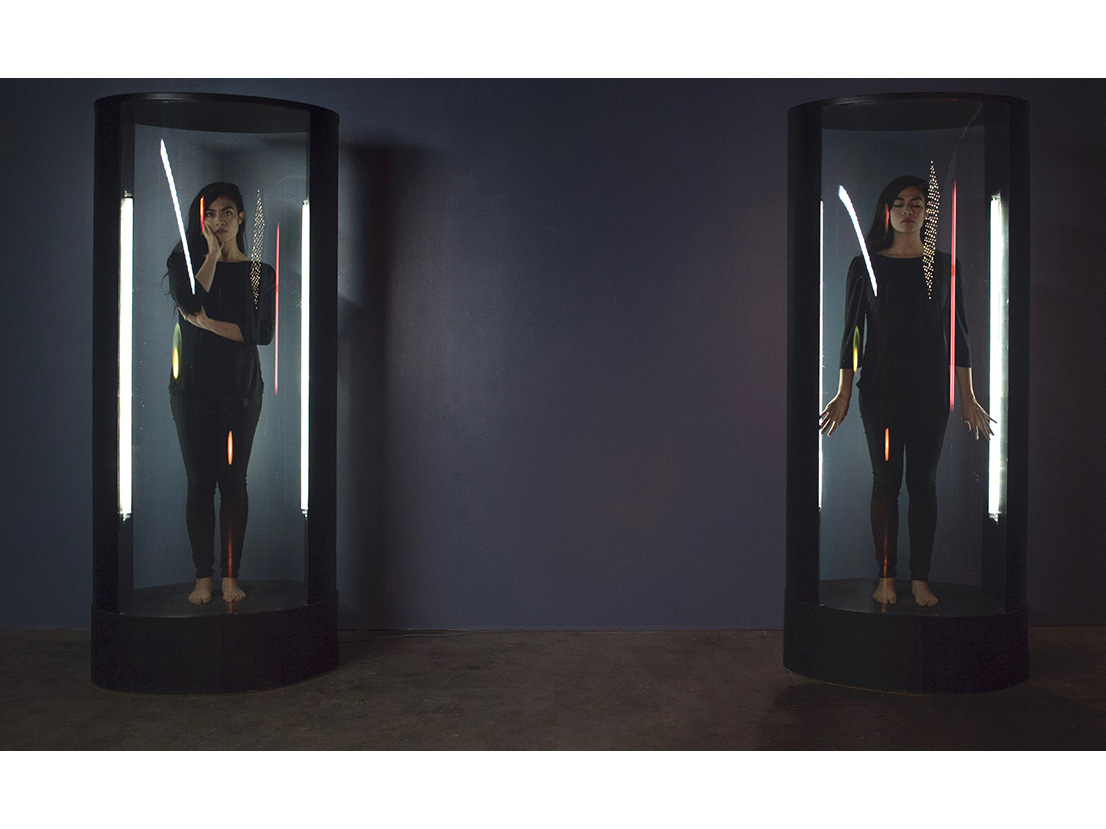 We Always Progress features the writer Ingrid Rojas Contreras, the artist’s wife and frequent collaborator, doubled and standing within a capsule. It is one of four three-minute videos projected onto two large screens positioned to form a corner. Although the capsule shares the retro-futurist look of many objects in the exhibition, Barber constructed it by removing the shelves from a display case for small objects, raising it onto wheels, and adding fluorescent lights. As in all the works on view, the materials are exclusively items thrown away by San Francisco residents. Contreras recites words from notes found by Barber that he at first thought were written by an analyst helping a client through a regression, but later discovered were jottings on Brian Weiss’s best-selling Many Lives, Many Masters. The two versions of Contreras speak about the imagined regression; one of her forms takes the role of the analyst and the other of client.