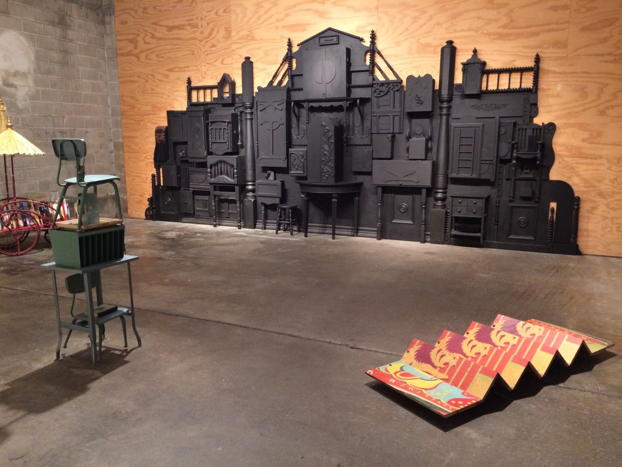 Covering one full wall is a sleek black sculpture of discarded wood fragments fitted together to create a work that resembles an antique furniture piece with differently sized cabinets and drawers, each containing a colorful, fantastical scene or object: Innards and Upwards: A San Francisco Wunderkammer. A wunderkammer, or cabinet of curiosities, is a Renaissance precursor to the modern museum. Each cabinet and drawer contains sculptures and collections created by Pebworth from materials that San Franciscans threw away. An elegant portrait of a horse occupies one cabinet, a red goldfish another, and yet another includes an assemblage of blue and yellow foam curlers and vintage wig clippings, while a collection of pine cones is laid out elsewhere. The central cabinet opens to reveal beady-eyed minks, some curled around each other at the bottom of the cabinet, others stretched along the cabinet walls, their noses pointed toward a square cabinet above, which contains a gilded flower with the word yes! at its center. Attendants open a subset of the cabinets at different times, controlling at Pebworth’s direction how much and what is on view. The black matte exterior frames and relieves the rich, material color of the contents. Pebworth and Barber both described contending with the overwhelming volume of recycled materials at the facility. Pebworth built her editing process into the beholder’s experience. Her Wunderkammer foregrounds selected viewing, and the cabinet itself offers her particular edition of the city—a vibrant, wondrous, and curious combination of parts.