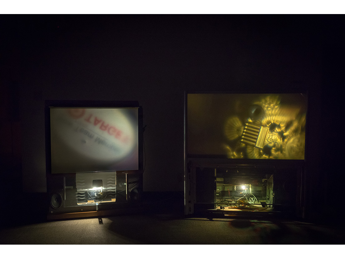 Several buildings away, Robb Godshaw‘s Big-Screen Debris reconfigures vintage technology like Barber does to create forms that suggest Pebworth’s Wunderkammer, but the results are unique. His main installations comprise rear-projection televisions removed of 100 pounds of electronics and replaced with slow-moving microwave motors. Rotating on these motors, small, commemorative objects—a caduceus, a military badge, a union-member pin—are projected onto the television screens from within. Godshaw makes visible these idiosyncratic objects, thrown out despite their hard-won value. Barber also described this confusing intimacy of excavating discarded objects that once had some personal meaning.