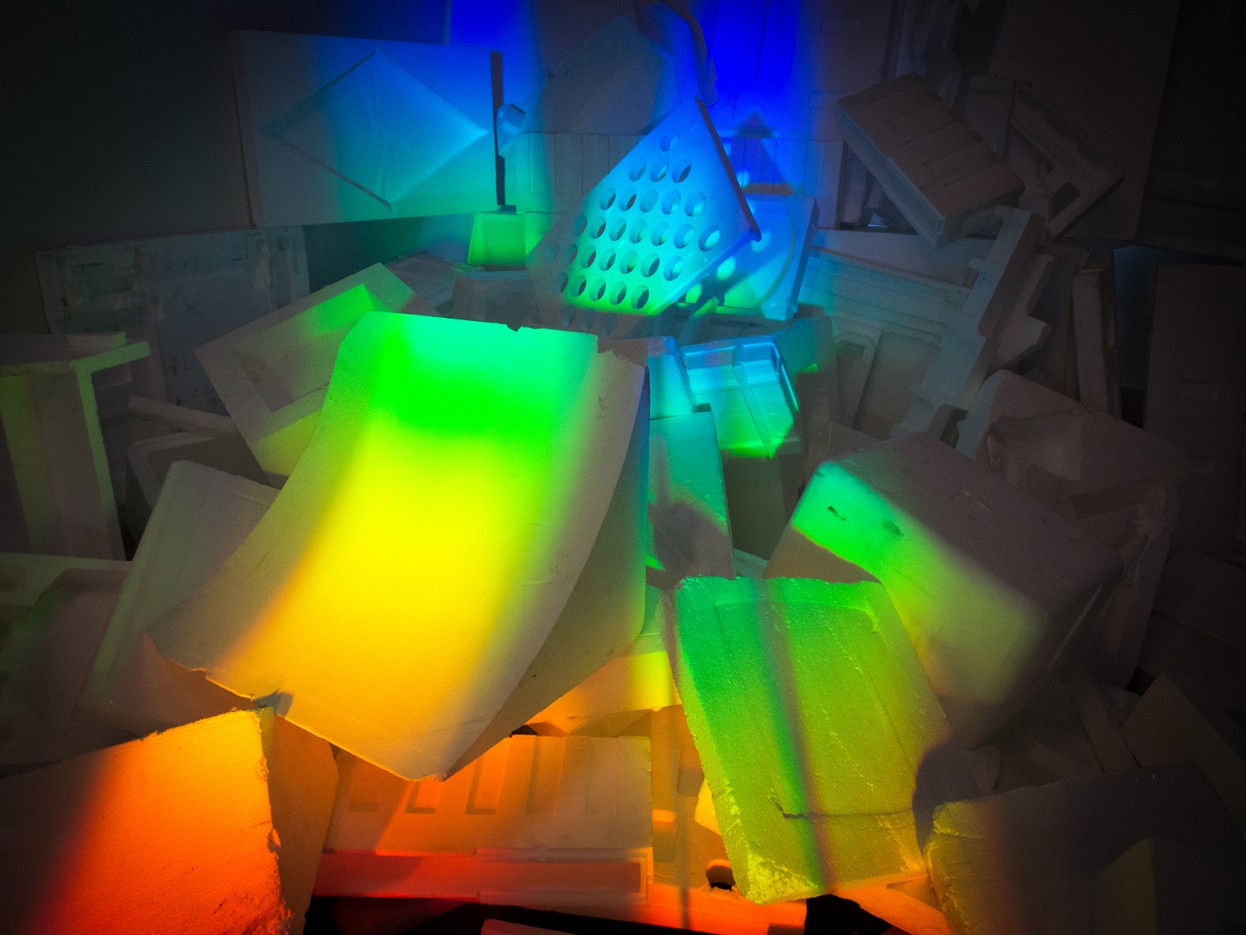 A stunning installation, Biodegradient, occupies the back third of Godshaw’s space. Two modified “voxbox” hologram-viewing boxes project a slowly moving spectrum across an assemblage of white Styrofoam forms. The rainbow traces over the bleached forms, washing them briefly with color, before leaving behind an ongoing expanse of white. The spectrum, or rainbow, is the ultimate bridge between perception and materiality; color is at once something produced through light and experienced through materials. If the reflected eye returning your gaze in Barber’s Survey renders the mechanics of beholding visible, and Pebworth’s Wunderkammer externalizes looking as an act of selection, Godshaw’s Biodegradient mediates between perception and material experience.