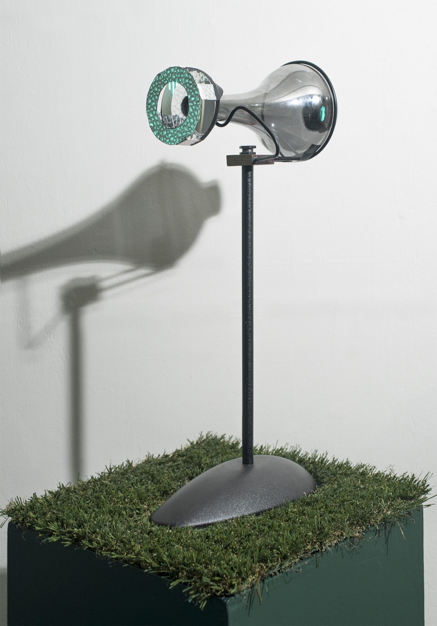 Jeremiah Barber. Survey, 2015–16; parabolic and cosmetic mirrors, lamp, custom stand. Photo by and courtesy of the Artist.