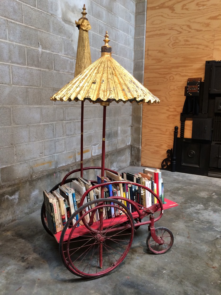 Alison Pebworth. Autobiography 1964–present, 2015–16; books, vintage wheelchair, parasols, gilt. Courtesy of the Artist.