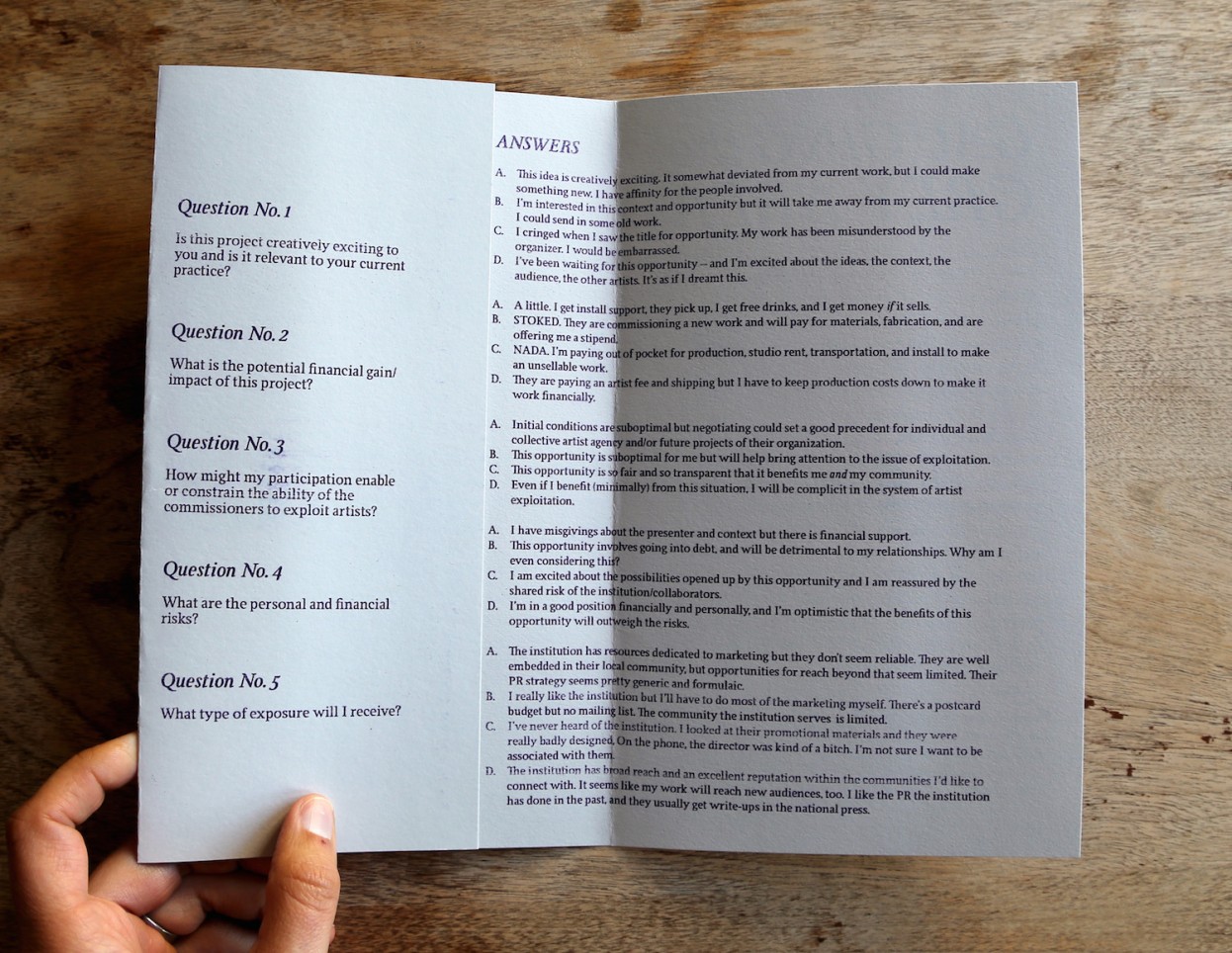 Helena Keeffe and Lauren van Haaften-Schick. "Gauging the Grey Area: Standards for Artistic Labor" broadsheet. Courtesy of the Arts Research Center, UC Berkeley. Photo: Joseph del Pesco.