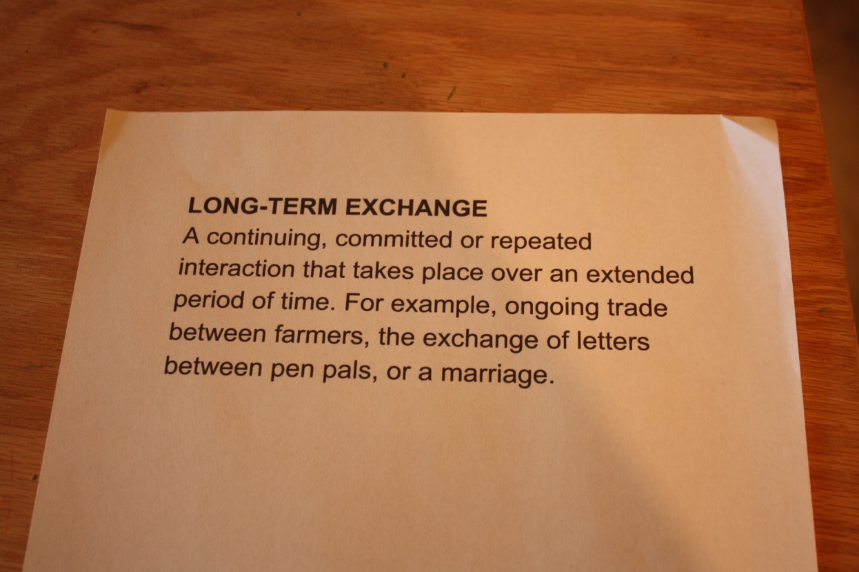 Juxtaposed to this, Woolard's "The Exchange Archive" was lively, forward-looking, and even daring in its pursuit of (almost but not quite) utopian exchange. Woolard had very direct questions and problems for our small sub-groups to debate and come up with suggestions. She had us deal with the idea of the "archive" (in all its complexities of canons and compensation) by making an archive of performance and time-based artists. By playing a kind of card game and placing our "bets" on a gridded outline on a table top, we all could see and feel the complexity of the task of creating an ensemble exchange archive project. I enjoyed the depth of the visual artists' knowledge and passion for "naming" the influential performance artists for this archive project. Several artists brought up how race is still so marginalized in these canonizations of valued art makers. Diversity is a constant ongoing ensemble project.