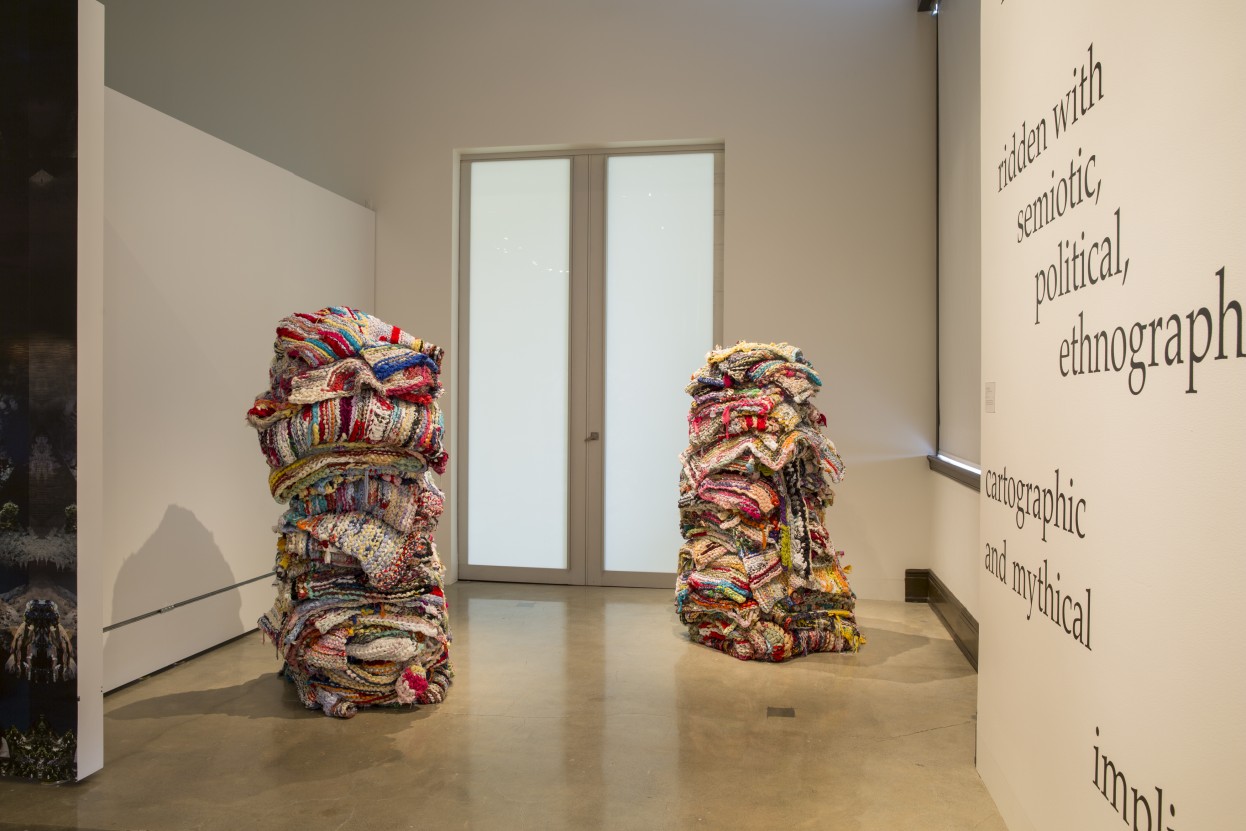Gómez-Peña’s multiple presences in the show particularly reflect the historical turn toward representing underseen cultural realms in recent generations. In addition to a live performance in conjunction with the exhibition, the single prominent pull quote from one of his longer works serves as a meta-statement of purpose for artists’ social function. Taking up Gómez-Peña’s long-pursued actions of cross-cultural resistance against stereotypes, prejudice, and marginalization, and likewise pointing to cultural viewpoints from Latin America, Vic De La Rosa’s elegant yet sharply critical flag pieces extend such artful critiques into the current moment.