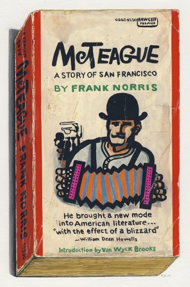 The paintings are also sidelong tributes to design. The salary men responsible for the smart book covers featured in Baker's pictures are forgotten. Too bad; the simple a that dominates the front of Andy Warhol's a, A Novel and the striking color, font, and line combinations employed for Frank Norris's McTeague or Miller's The Air-Conditioned Nightmare speak to the care and creative flourish brought to so much twentieth-century