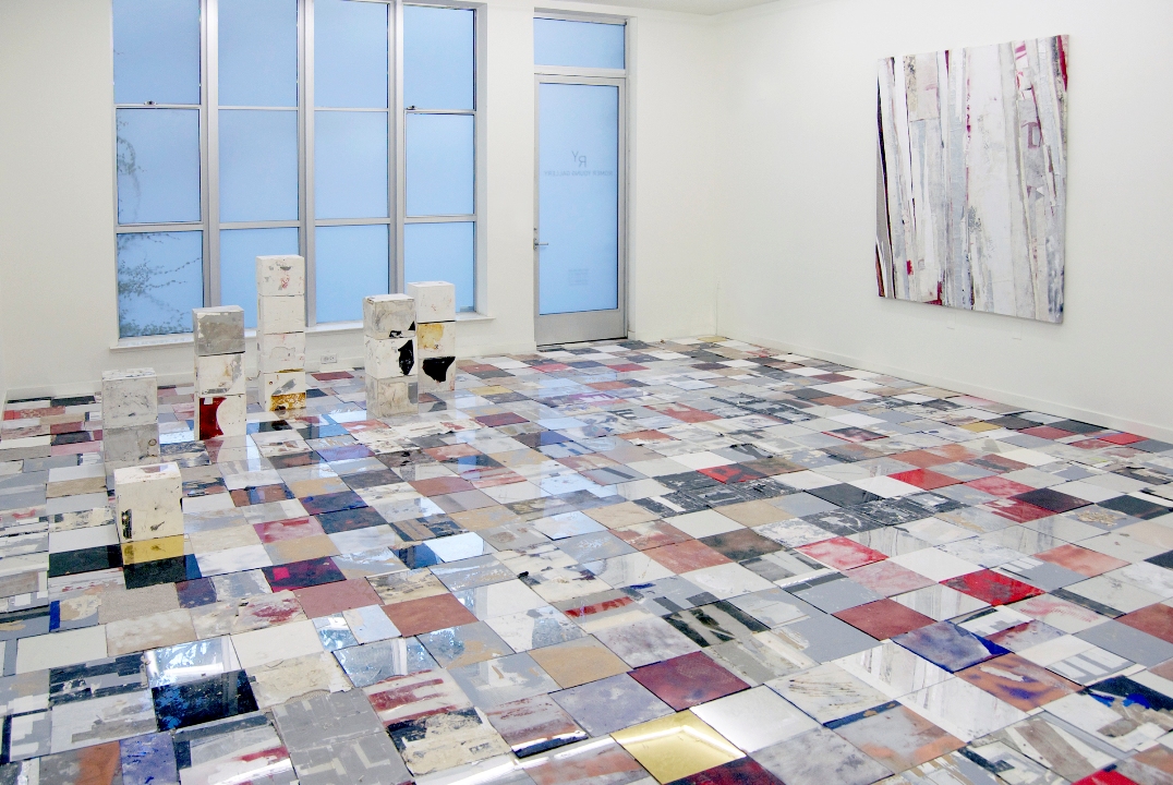 Immediately after the door, a random collection of 10-inch square tiles is gridded across the entire gallery floor. Each tile is impressively composed of layered construction materials, paint, and other detritus in aesthetically familiar ways. The installation, Pitch (2015), cracks, moans, and shifts with each step as the unevenness of the tiles pushes through the bottoms of one’s shoes. The dirty squares of Plexiglas and mirrors murky with dust reflect one’s image to effectively mimic wandering through an abandoned building or junkyard. The installation emphasizes the physical act of looking, and implicates viewers in its grit and (with its distinct Abstract Expressionist allusions) macho valor. When the tiles are considered singularly, arresting compositions and surprising material juxtapositions lurk quietly in the sea of cracked plexi and mangled duct tape. But together, as an installation, these smaller significant moments drown in the oppressive grid imposed by the installation’s scale.