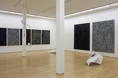 The sculptures on view seem to fall more readily into Widholm’s notion of bad art. A large hanging mobile, Untitled (2012), slowly twists in the center of the gallery. Hanging from its steel armature are six pieces of white enamel-painted metal, crumpled like discarded sheets of paper. Two more crumpled metal sculptures lie on the gallery floor. Unlike his paintings, Reeder’s sculptures look more overtly like junk or metaphorically like failed ideas that missed the wastebasket. The artist’s wit is more apparent in these pieces—less veiled behind his ambiguous sincerity.