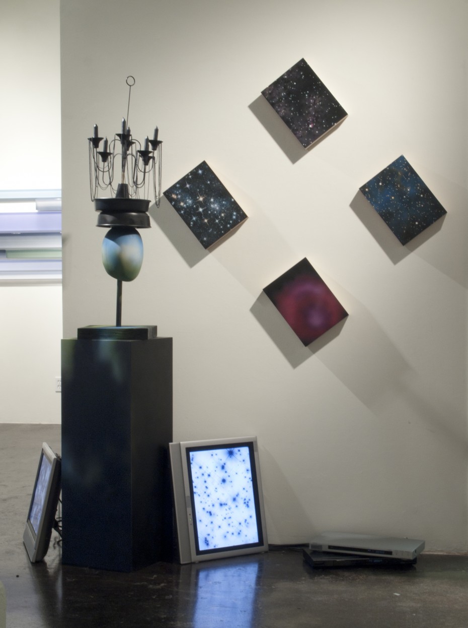 In stark contrast to the singularity of Drift Continuum is the work of Desirée Holman. Here, Holman—who has been developing her art practice around the creative analysis of the convergence of anthropology, the occult, science fiction, and technology—presents a chaotic tangle of sculptures, paintings, and video installations filled with imagery composited from symbols that resonate across different systems of belief. Thus, painted images of galaxies and video installations of nebulas taken from NASA photographs become the means to explore the overlaps between astrology, alien mythologies, and other “fringe” beliefs, as well as recent technology and the larger contemporary faith in science. For example, the sculptural assemblage Psionics 18 resembles a piece of wearable hardware, a fanciful tool to travel through time and channel spirits. Psionics 18 is a humorous nod to the field of augmented reality and inventions like Google Glass, with technology (both real and imagined) seen as a means to tap into a previously unseeable spectrum of information.