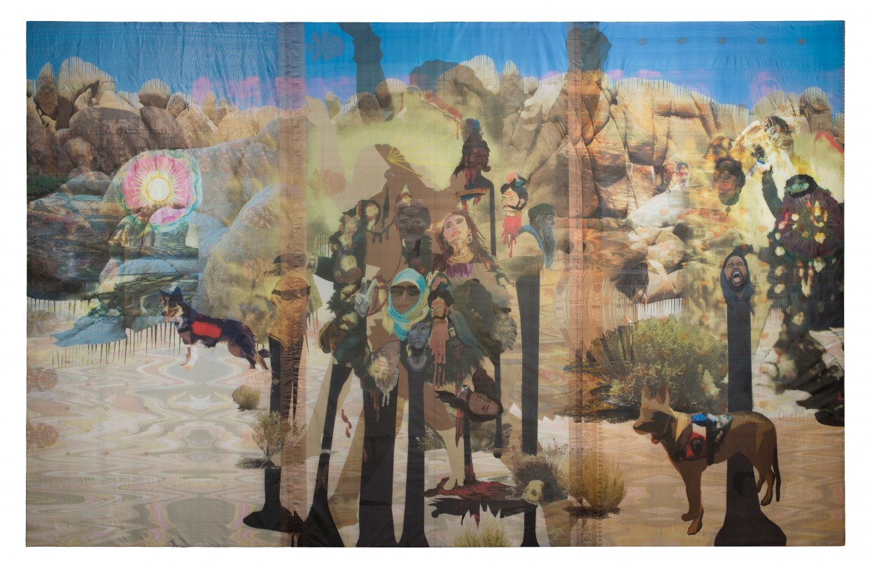 Ranu Mukherjee. Desert Bloom-models, protesters, service dogs, 2013; ink on silk; 90 x 132 in. Courtesy of the Artist and Gallery Wendi Norris, San Francisco. Photo: Mayumi Hamanaka.