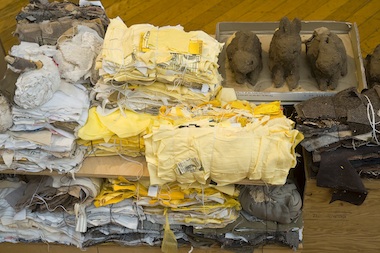 cloth objects. She includes all her signature work: mud-soaked towels that form a sad little bear; kachina-like totems, half-rabbit, half-human, made of small bundles of cloth remnants; mud bunnies; her owls formed from manmade materials that capture the essence of those beasts in a way that only Spence’s years of dedicated birding makes possible. Piles of carefully arranged thread form bouffant hills of color. Carefully folded and bound scraps of cloth are organized in a parody of industrial production. Piles of girly hair clips and related detritus form a particularly icky Bruce Conner–like assemblage.