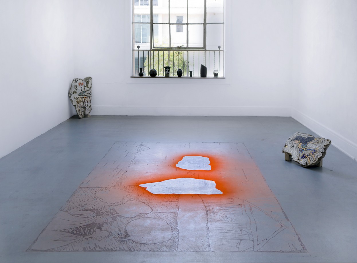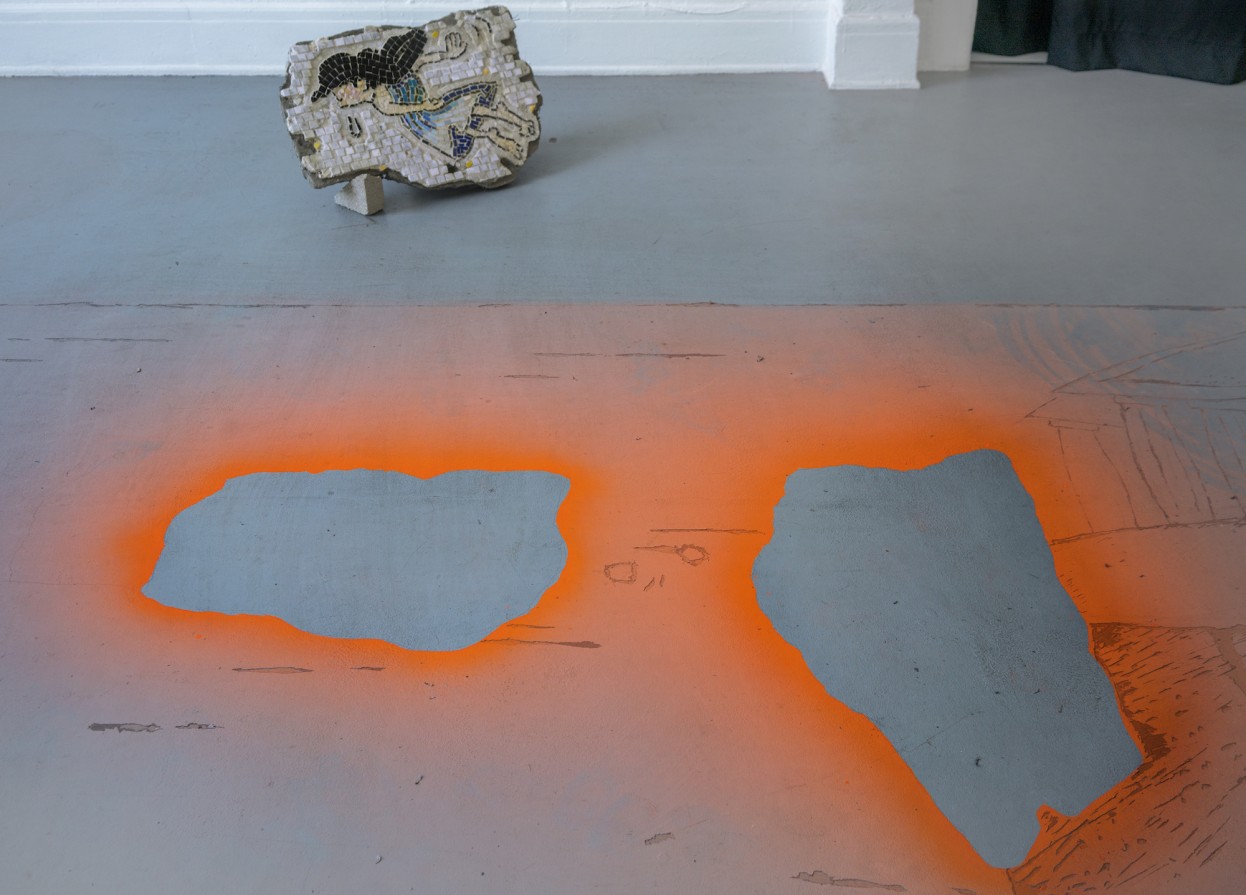 The entrance gallery (the larger of two) comprises several works that are embedded in the architecture of the space. Tempestt Hazel’s elegant installation, Letters (2017), is lined up on the windowsill: ash, wood, glass, and other found ephemera scattered among ceramic vases. Joeun Aatchim’s installation, A Passionate ‘Female’ Poet Who Committed Suicide with a Brokenheart / Her life remains in haze…Highlighted as a ‘victory of love’ by Alphonse Daudet (2017), is centered squarely on the floor, and two accompanying tessellated mosaic works, Cliff (2017) and Sappho (2017), are propped against the wall. Though elements of the work are somewhat contextualized in its lengthy title, the narrative is broken, literally, into pieces. The mosaics are like puzzle pieces that are supposed to fit neatly into empty splotches delineated by orange spray paint. The artist’s name, too—two Korean words that translate into “good morning”—shrouds the work in further mystery.