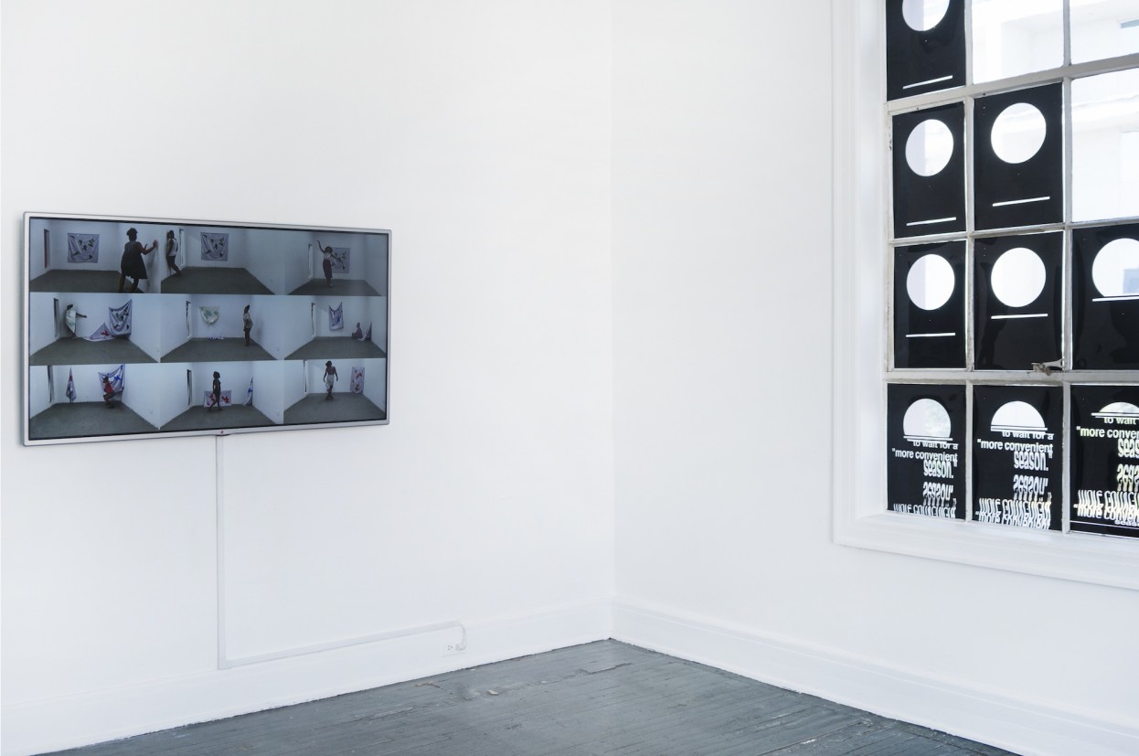 As with many exhibitions and projects that pass through Visitor Welcome Center, stutter gathers an intimate group of players that hu befriended and became acquainted with during her time living in New York. Sonia Louise Davis’s five-minute video, August Studio Movement Score (2017), was created for the exhibition, chronicling each day of August the artist spent in the studio. Comprising nine channels, the piece does not spell out the chronology of the footage. The rhythm of studio work both coincides and clashes with temporal realities, such as that month’s Charlottesville tragedy. In the same space, Davis also exhibits a number of beautiful color-blocked textiles with electroluminescent wires that can be activated with a button. According to the time of day, the gallery and the works lining the walls respond to the added light. Similarly, Kameelah Janan Rasheed’s “a more convenient season” (after dr. martin luther king jr.’s 1963 letter from birmingham jail) (2017) lines several panes of a large window, at times letting in streams of light, at other times obscuring them.