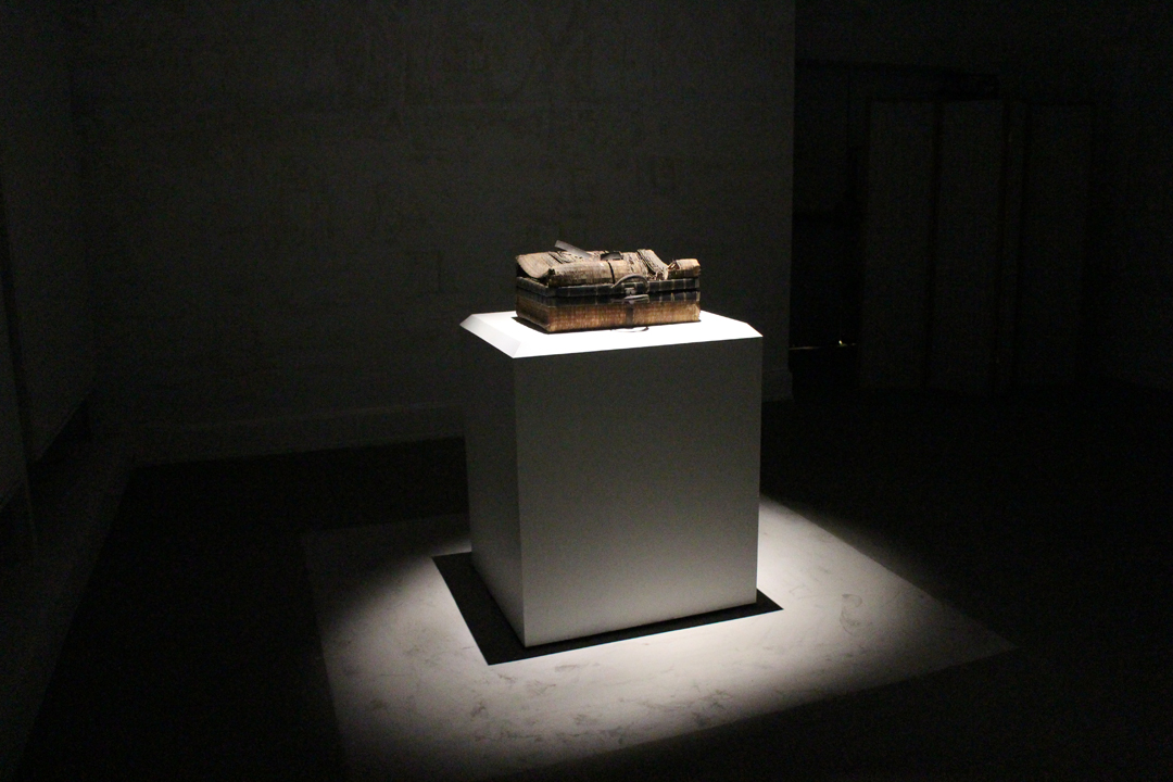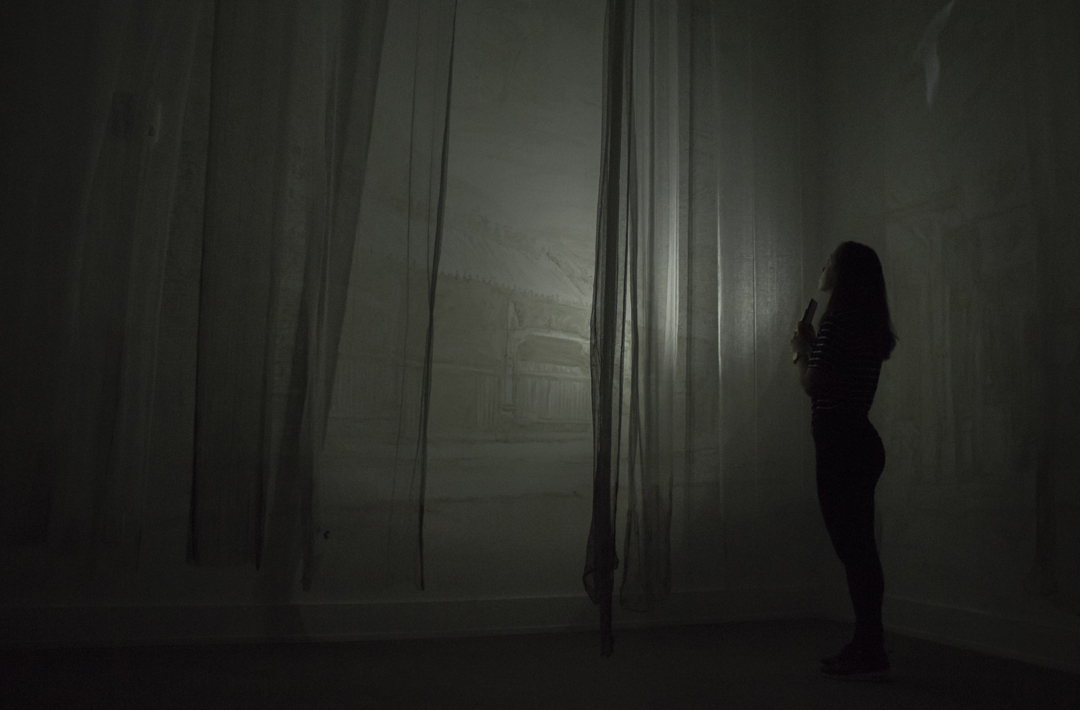 Entering the cavernous installation, I am forced to search. I hear indistinct murmurs in Mandarin or Cantonese, but I can see nothing. I finally catch a glimpse of translucent white cloth, and what appears to be old Chinese buildings painted on the walls—though when I move closer, all I can see are dried-out, greyish streaks. Scene after scene appear and disappear as I move through the rooms, until I face a small, worn casket on a pedestal, bathed in light, with a chair placed before it. From the shadows beyond emerges a grid of boxes, as inscrutable as the scenes are elusive.