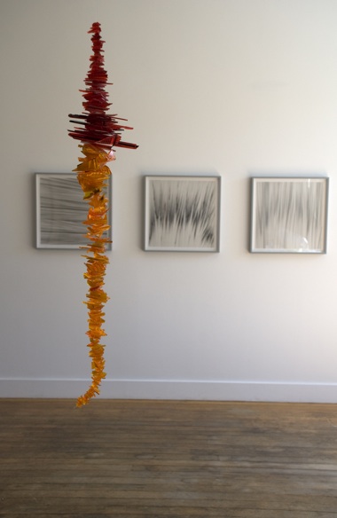 Vein (2010), a collection of reflector pieces, hovers as a reflection from the light that created it. Its shape—bands of vibration, striations of light—floats as though satellite crystals coloring our individual worlds. Outlook (2010) offers a reflective glimpse in order to glean memory: its collection of bright yellow road signs have been burned by the light of the sun, and only a slight shadow of the forgotten remains of a chain-link fence is witness to where they were found.
