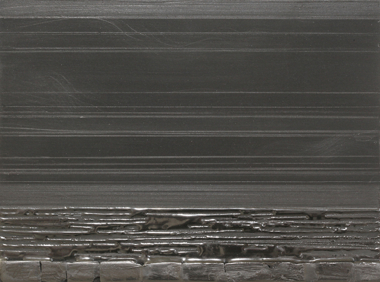 The Nocturnal panels are interspersed along this line and also installed in the adjoining gallery. Powdered graphite has been applied in matte and lustrous layers and in melted drips, chunks, and corrugated lines. This is no minor technical feat as graphite, like its carbon sister the diamond, has an extremely high melting point. But it is the softest of the carbons as well, and in landscape reliefs, like Nocturnal (Stacked Bands 1) (2010), each “gesture” and scratch leaves a trace. The polished bands in low relief at the lower edge of the panel are burnished and reflective, eerie metaphors for the night sea. In Nocturnal (Rise and Fall) (2010) and Nocturnal (Starfield 5) (2010), polished graphite droplets and their auras stand out dimly but convincingly, like stars in the light-absorptive sky. They recall the labor-intensive pointillist drawings of Vija Celmins’ night skies, also graphite marvels, where the starry whites are left white and the dark around them is rendered like smoke.