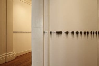 In Sfumato (Horizon) (2010), Fernández takes the measure of the gallery’s physical space and runs a precise line of graphite nuggets at shoulder height around the perimeter of a long corridor. Attached by magnets to the wall, each chunk—raw, faceted, reflecting black light—casts its own graphite “shadow,”a powdered smudge on the wall itself. The graphite chunks are beautiful in a rough way, each one different. The continuous line reads as a “waistband” meticulously stitched or a rosary of beads visually “fingered” one by one by one. Fernández speaks of the ambulatory viewer as a main ingredient in her work, and this piece depends on that walk for its full experience, like marking the Stations of the Cross on Good Friday.2 The somber rhythm and smoky darkness of the pieces call to mind the soot-stained walls of Ann Hamilton’s devotional installation Accountings (1992), at the Henry Art Gallery, in Seattle. Mineral nuggets on the walls of this historic San Francisco house also resonate with the local history of mines and gold seekers.