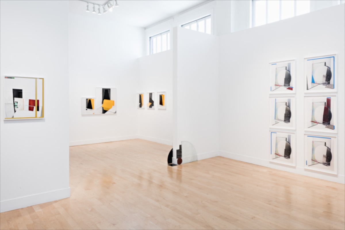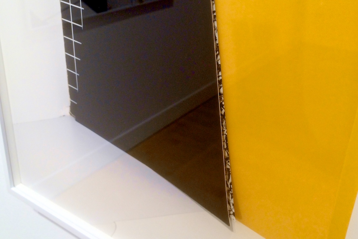 Maisel has further complicated the exhibition’s spatial relationships by including a number of small, low installations constructed from the materials he configured to generate his images. These casual yet precise arrangements are leaned against walls and tucked in corners. They offer more surprises and produce a seductive rhythm that helps structure the show, drawing viewers’ eyes down to the floor and then up again to the wall-hung works. These low sculptures also interact directly with the gallery space. They bring into consideration everything from a flat file in the front gallery to the packaging glimpsed in the back room. In creating these carefully coordinated relationships, the artist treats the architecture of the gallery like a giant version of the space within one of his individual works.