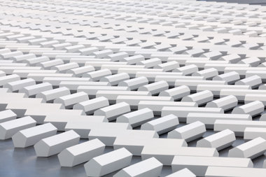 It is challenging to satisfactorily describe The 2000 Sculpture with written words. De Maria has posted the piece’s physical characteristics on the wall, highlighting the challenge of verbally and numerically expressing the experience of viewing and moving around the work. The 2000 Sculpture is composed of two thousand polygonal white plaster rods arranged on their sides on the ground. They are placed in rows forming a herringbone pattern of twenty by one hundred units. There are eight hundred five-sided rods, eight hundred seven-sided rods, and four hundred nine-sided rods arranged in a pattern of five-seven-nine-seven-five and five-seven-nine-seven-five. Each rod is fifty centimeters long and approximately twelve centimeters high and weighs twelve pounds. The overall length of the piece is fifty meters (the total length of all the rods laid end to end would be one kilometer), and the total weight is twelve tons. These are the concrete facts of the piece, and yet they give little impression of the sensation of standing before it.