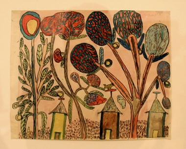 All of the watercolors depict some element of nature. Most are landscapes that describe fantastic botanical worlds full of inventive color. A painting on the left side of the grid, signed “Chiota S.,” shows a cluster of hand-like trees set against a salmon background. Branches rendered as slender digits curve up toward blue-green circles filled with amorphous red shapes. Within the ambiguity of these clusters, description begins to give way to irregular patterning. Small houses line the bottom of the composition and are grounded by discrete graphic marks that read as both scrubby grass and abstract texture.