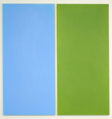 The six works in the show consist of pairs of monochromatic canvases: green and blue, white and grey, brown and blue, blue and blue, blue and brown, and blue and green. The last is the largest work, Mother E (2009), which evokes the expanses of verdant land and briny ocean that cover the Earth—the E its title suggests. Unlike the rest of the pieces in the show, the tall rectangles of Mother E form a unitary mass, an abstracted square atlas that structures our understanding of the paintings that surround it.
