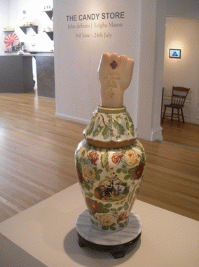 June 16, 2010If we regard laughter as a kind of expulsion, even a kind of vomiting, then “The Candy Store,” at Meridian Gallery, is a mess. It’s sticky, sweet, and smelly. It’s cute and at the same time grotesque. Of the many treats on display, one particularly beautiful mess is John deFazio’s The Budweiser Power Urn (1997). Elaborately decorated with wallpaper-like leafy prints, a tattooed, bug-eyed skull, and a Budweiser bottle label, this urn mixes the slapstick punch of a Kippenberger with the earnestness of a prayer. In restless play with deFazio’s other urns and sculptures, this piece succeeds in bypassing laughter as an end in itself and instead employs it as a means toward a meditative state.