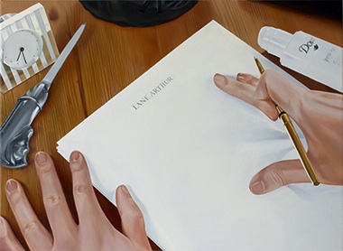 February 23, 2010Lane Arthur's Tabletop with Writing Utensils (2009) is currently on view in “The Women,” a three-person show at NOMA Gallery. In the painting, a woman's hands, a letter opener, a stylish clock, a gilded pen, and a bottle of Dove lotion act as the key players in a staged scene of writing. Based upon a still frame from the 2008 film The Women, Arthur’s Tabletop introduces a character who is set up to write a letter. Is this character an actress from The Women, or is she Lane Arthur, the artist, whose name appears at the head of the stationery before her?