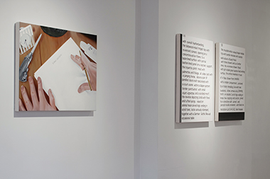 Considered alongside the blank letter, 155 and 92 give the viewer hope of obtaining knowledge, reading a story, filling in the space left bare on the tabletop. But the text paintings—like the painting of the writing utensils—are merely sets of pre-existing fragments, descriptions of objects that do not seem to come from any one person and do not communicate a unified message.