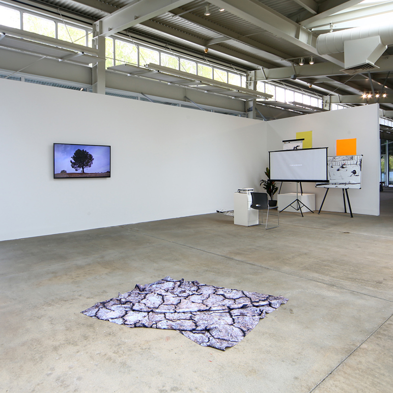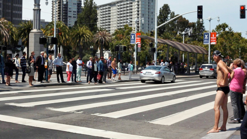 The weaker works in the show played more like one-liners next to these sophisticated reflections on artists and labor. Chris Sollars’ film The Swimmer (2013), adapted from the 1964 John Cheever short story with the same title, induces a good deal of laughter, but lacks the sharp subtext prevalent in artworks by Carland and Rhoades. In Cheever’s short story, the main character, Neddy, hops from one neighbor’s pool to another, tracing a new route from a friend’s home to his own. In the film, Sollars follows Neddy’s lead, donning a Speedo, goggles, and a swimming cap and plunging headlong into the fountains, public and private pools, and ponds dotting San Francisco. Traversing the city from bay to ocean in nothing but a swimsuit, Sollars is unnoticed by the pedestrians he passes as he jogs from one body of water to the next. Cheever’s story is commonly interpreted as a metaphorical reflection on changing social relationships across a lifetime. While Sollars’ film does showcase the unseen public, semi-public, and private spaces in the city, it falls short of the poetic quality of the story on which it is based. Rhoades, Carland, and Khalaf each succeed in letting the viewer in on the joke, using collusion to problematize creative labor. The Swimmer, however, never transcends the spectacle of the performance. Sollars keeps us in place as viewers, instead of transforming us into his conspirators.