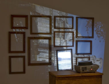 In With Pen in Hand (2010), two slide projectors display travel snapshots from Piraino’s family archive on a wall of empty picture frames. Images of a Spanish bullfight, a holy site, natural landscapes, and two posed, smiling women co-mingle. No contextual clues are supplied. The installation’s ambiguity is enhanced by the slides’ reversals and rotations, which reinforce the inscrutability of the documents: What meaning did these people and places carry for the photographer? What does the artist learn about herself from them? The images, like the fullness of lived experience and identity, exceed the picture frames.