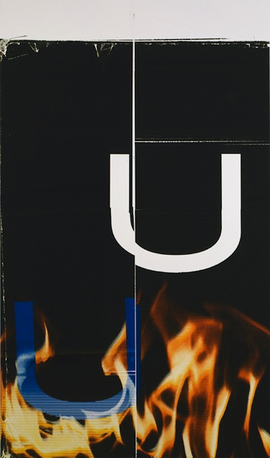 This is not a very promising impression to make in the mid-career survey of an artist only forty years old. In order to dispel it, Wade Guyton OS (OS stands for "operating system") must battle two prevailing interpretations: 1) that Guyton's oeuvre essentially boils down to one monolithic project—namely, painting within the prescribed parameters of word- and image-processing software and inkjet printing, with the software setting possible fonts, positions, and resolution and the printer setting color tones, print quality, and so forth; 2) that Guyton's language, though superficially derived from contemporary technology, is in fact essentially retrospective, motivated above all by reprising the tropes of the modernist moment (his 2007 series of rectangular black monochromes, for example, invites comparison to Rothko or Reinhardt). Only in dismantling these assumptions might the lingering sense of finitude give way to one of possibility.