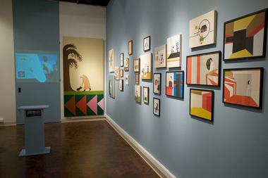 The exhibition’s most significant weakness is the safe and unnecessary segregation of its various elements. The small painted works hang in a crowd on one side of the exhibition; the murals fill the rest of the space, with the animations and music video playing in a loop on a single monitor. The presentation feels overly tame—opting for straightforward legibility rather than maximum impact. As a result, many of the connections between these elements are muffled. For example, the installation makes it difficult to discover that fragments contained in some of the small gouache works are directly reproduced and expanded in portions of the large murals. I found myself wishing to see more of the kind of uncertain blending that occurred in Margaret Kilgallen’s installations, in which preexisting works combined with site specific wall paintings to create a single cohesive whole. Rojas has produced such magically coordinated exhibitions in the past; I wish that this rather impressive outing had more of that unexpected alchemy.