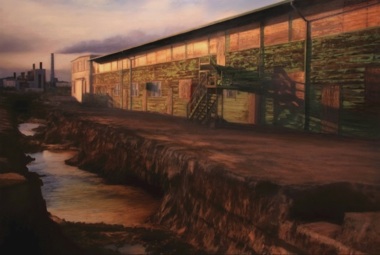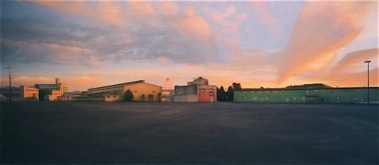 The shipyard is geographically surrounded by water on three sides and is circumscribed by clear light and good weather. In Beckelheimer’s poetic paintings, the artist offsets the ghostly and apocalyptic landscape of the abandoned shipyard and the nearby but recently demolished PG&E smokestacks with his depictions of the beautiful light. In the spirit of the Venetian Renaissance painters Bellini, Titian, and Giorgione, he creates a soft atmospheric rendering of the shipyard by painting wet into wet oil paint, creating layers of transparent glazes. The harsh subject matter, seen through these glazes, creates a romantic fiction that seduces the viewer and tells profound truths like a good novel does, ones deeper and more meaningful than mere reportage can offer.