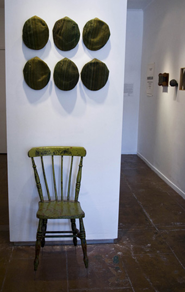Mie Preckler. 500 Cap'sTreat, 1983-5; chair and Irish-tweed caps. Courtesy of the Artist and Chandra Cerrito Contemporary, Oakland. Photo: Dasha Matsuura.