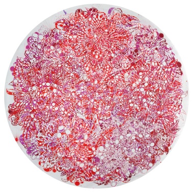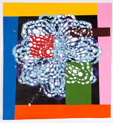 Pinko Salad (2010) and Lemon of Pink (2010) also center on basic floral shapes. Both also seem to have been used as their own stencil, with cut-out holes and the painted marks that match them radiating from a central fold line. Painting through the holes creates a false impression of symmetry, as each painted dot or ellipse is matched to a hole on the other side of