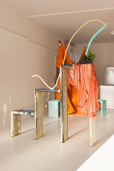 In one of these sculptures, a black-tiled box on casters acts as a pedestal for a squiggly tubular form that ends in a bouquet of papery statices. At its highest point, the pink-and-black tube is supported by a hook of black rope, which is frozen in space and ends after about five inches. What once required hoisting to defy gravity now resembles a magic trick. A similar illusion occurs in a large-scale sculpture in the back left corner of the gallery: two red-rubber-ended spring clamps seem to hold the corners of a giant orange-painted carpet pad aloft as it stiffly drapes over two turquoise benches. The verso shows that the clamps are actually latched onto wooden support beams. But knowing that doesn’t cause the magic to dissipate, mostly due to the attention Füllemann pays to the surfaces of this sculpture and the variety of colors and textures he achieves with little more than hardware-store goods and a few coats of paint. Repeatedly, the juxtaposition between identifiable elements (orange vinyl-coated chain) and not-so-easily-placed materials (something that appears to be athletic mesh) is what makes Füllemann’s pieces so tempting to touch.