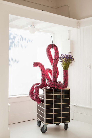 The first three pieces inside the front door feature actual greenery, which is not as unusual or as contemporary as one might think. In an article for the San Francisco Museum of Modern Art’s Open Space blog, the curator Arden Sherman writes about the “defoliation” of the art gallery. Where once potted plants were de rigueur in galleries, concern for the conditions surrounding increasingly valuable pieces of art led to their banishment by the mid-1980s. Sherman writes, “Perhaps paradoxically, in the very moment of plants’ eviction, artists began to incorporate living matter into their work.”1 While n/a is a remarkably white space, Füllemann’s plants seem less like a critique of a sterile gallery than a playful attempt at lending the sculptures the utilitarian purpose of extremely elaborate vases—and Sung’s verdant backyard is a perfect bookend to such sculptural plant life.